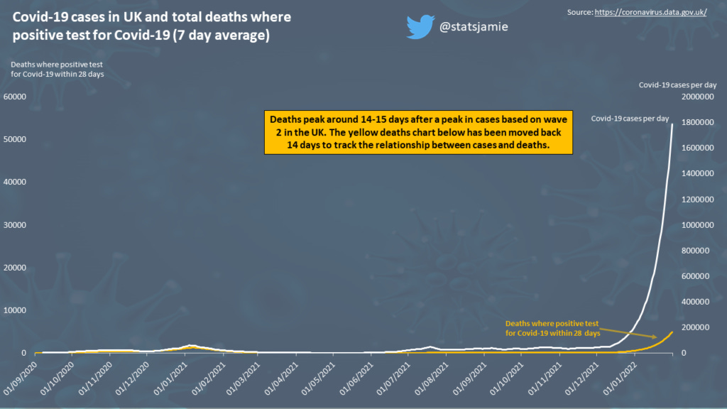 There is a relationship between Covid-19 cases and deaths and if you track them through the pandemic, deaths peak around 14-15 days after an identified infection. I have plotted cases and deaths since last September with the deaths line moved back 14 days and set the axis so the two lines peak around the same point during the second wave.