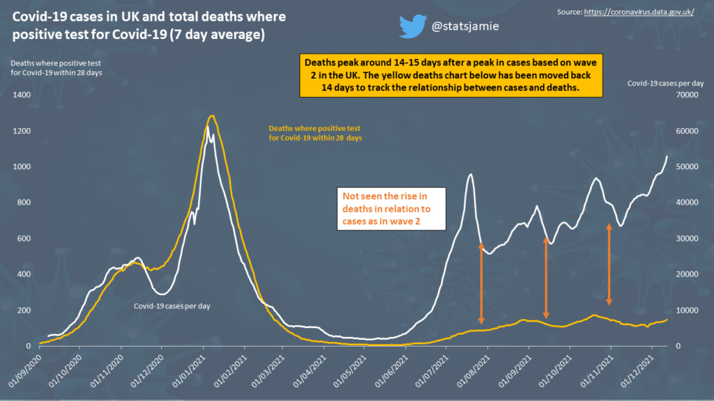 At the moment within the UK, the average rolling 7-day number of deaths is around 120 from around 43,000 cases 14 days earlier. If we assume the Omicron variant is as deadly as the Delta variant, I have plotted what would have to happen to the number of cases in the UK to arrive at 5,000 deaths per day shown in the chart below. For this to happen, the scale of increase would mean the chart of the past 21 months would be a mere blip on the chart.