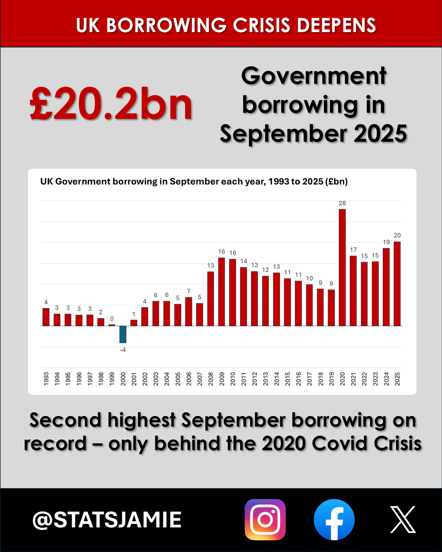 The latest figures from the ONS paint a grim picture for Britain’s public finances. In September 2025, the UK government borrowed £20.2 billion — the second-highest September on record, topped only by the Covid lockdown year of 2020.