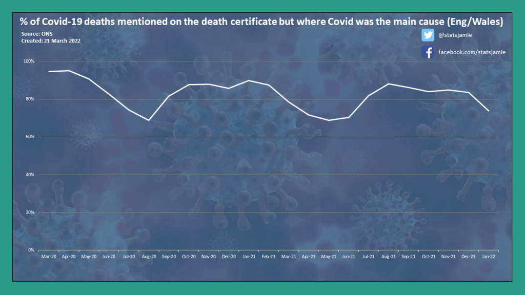 People often ask how many deaths were due to Covid and how many happened to just have it mentioned on the death certificate. If we look at the ONS data, we see that while it varies by month, 88% of deaths where Covid was mentioned on the death certificate, it was the primary cause. This has fallen in recent months since the Omicron variant emerged with the variant more likely to be found in people due to the sheer number of people with it, but it being less likely to kill you. In recent weeks, just two-thirds of deaths with Covid on the death certificate had the virus as the main cause.