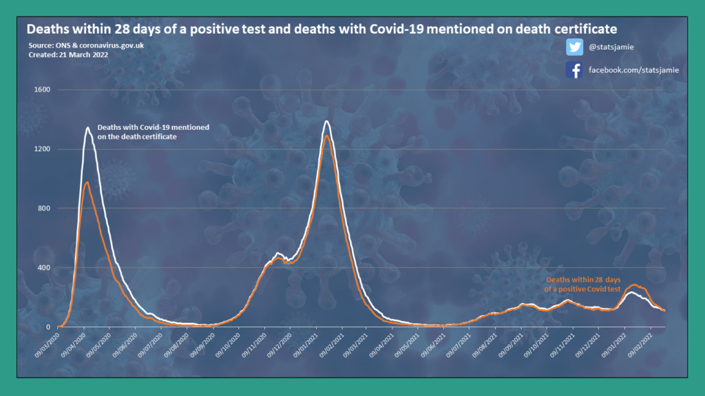 Each week, the Office for National Statistics (ONS) publishes the number of deaths in England and Wales where Covid-19 was the underlying cause, which most of us would understand as the primary cause of death. In addition, they publish deaths where Covid-19 was not the primary cause, but mentioned on the death certificate, so a factor in the death. Separate numbers are available for Scotland and Northern Ireland from their respective statistical agencies. These statistics are a better metric than those with a positive test. as Covid has to be listed on the death certificate to be included.