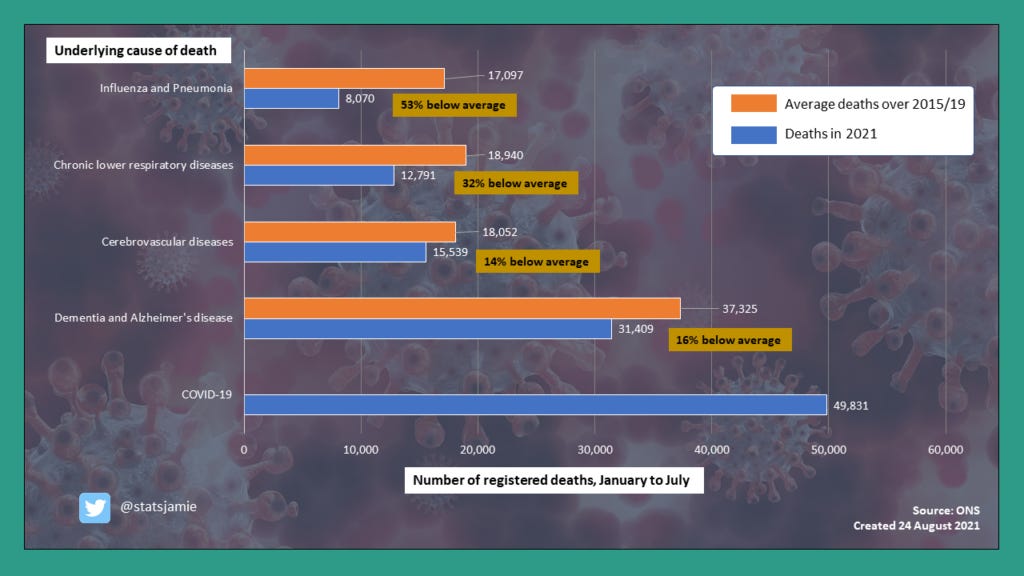 In 2021 we have seen fewer people die from dementia, respiratory disease, and influenza/pneumonia than expected. Is this because people are not succumbing to these conditions, or having caught Covid-19 they died from this instead. I look at the numbers to explain more.