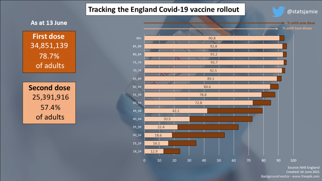 Right now across England, 79% of adults have received one vaccine dose, with 57% receiving both. But with the vaccine rollout prioritising those most vulnerable, those at most risk are far more likely to have both doses. For those aged 70 and over, over 90% are fully vaccinated so we know the vast majority of those at risk by age have vaccine protection they did not have before. It is not 100% as some people will have chosen not to have the vaccine and some cannot have a vaccine for medical reasons, but it is significant coverage of those at risk. As of 6th June, of the clinically extremely vulnerable across all age groups, almost 90% had received both doses of a vaccine.