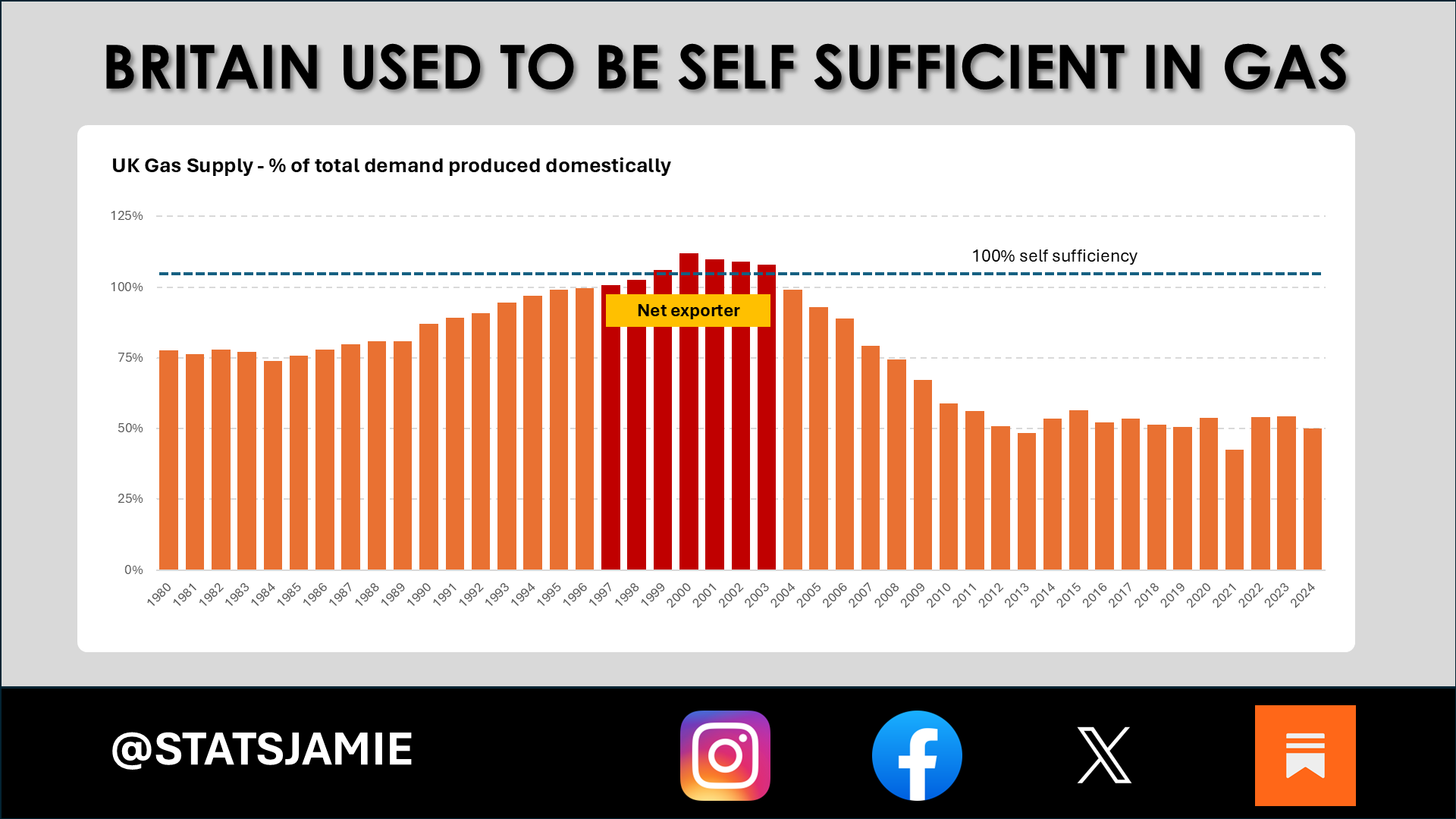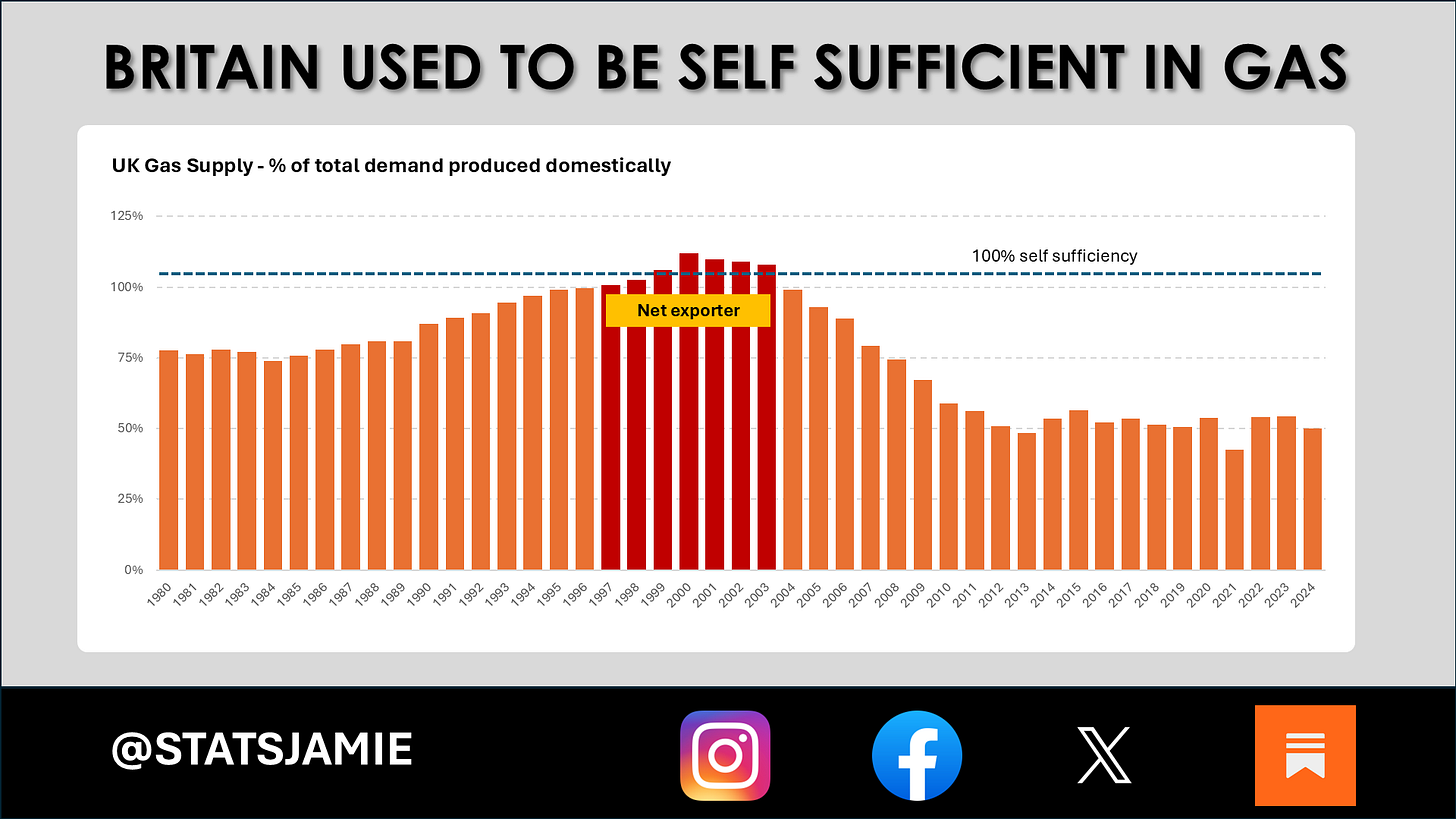 Over time, that position reversed. As North Sea fields matured and fewer new ones were brought online, domestic production declined — slowly at first, then more sharply. The UK moved from producing almost all of its own gas to importing around half of what it uses today.