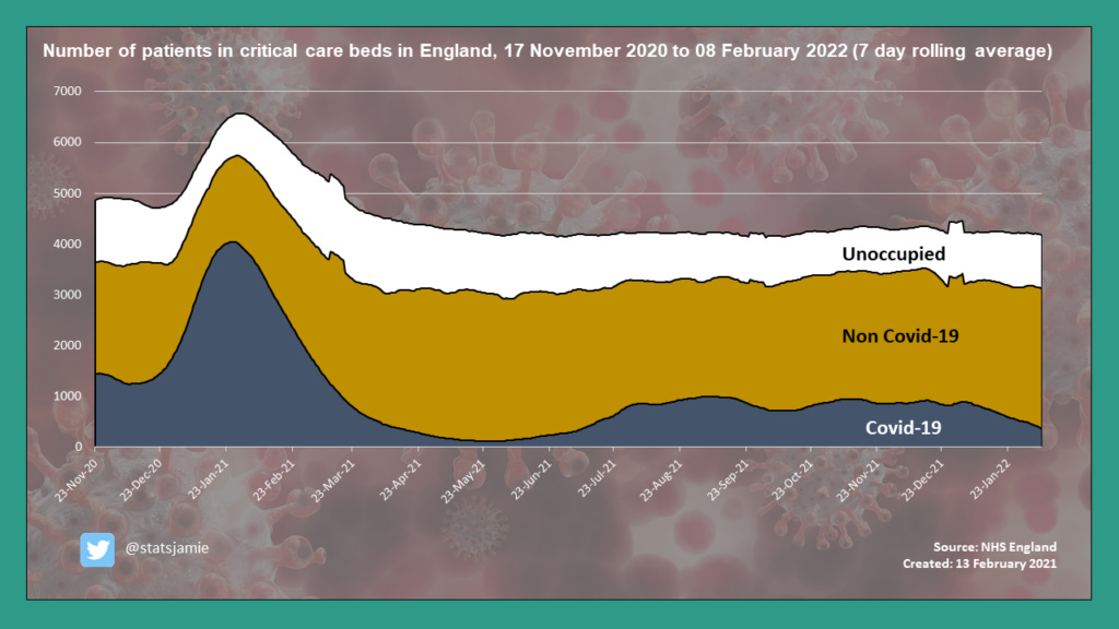 Looking 12 months on and with a less virulent strain of the virus, most of the vulnerable vaccinated, and huge numbers having recovered from Covid, the numbers in critical care do not differ from life before the pandemic. The total number of patients in critical care beds in England has actually been lower than three of the last four winters before the pandemic struck.