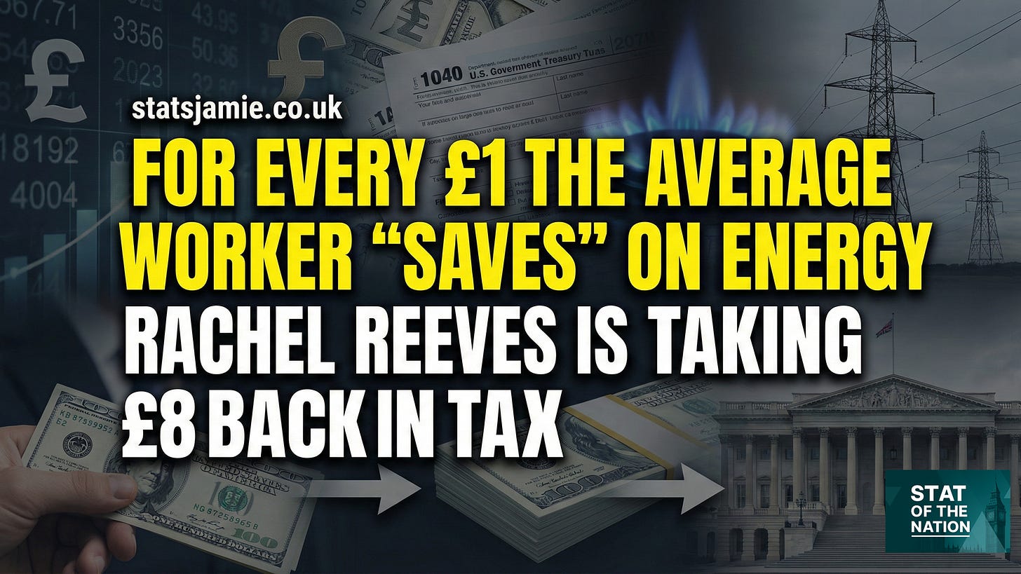 The 8x Ratio: While the latest Ofgem figures show a typical household saving of around £117, the state is quietly seizing £888 in extra tax from that same worker. That is nearly eight times more taken than given back.