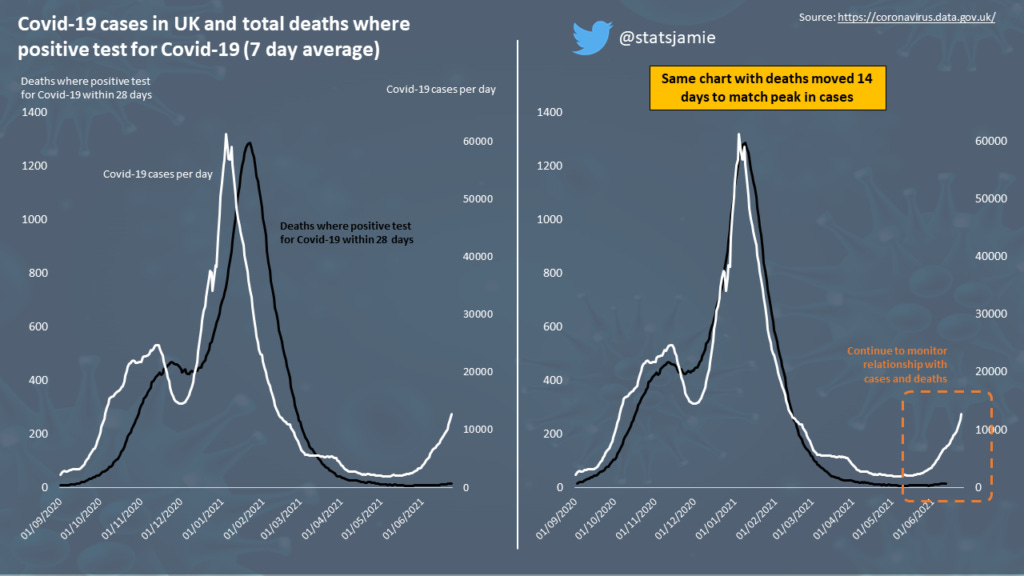 A plot of cases (left-hand axis) and deaths (right-hand axis) shows the latter peak around 14 days after the peak in cases. Aligning the two peaks, you would expect to start seeing a rise in deaths now in the UK if the same pattern of before continues. With cases among older people not rising significantly, and many having antibodies, it would surprise me if there was a surge. Public Health England analysis suggests that vaccines are highly effective against hospitalisation from the new Delta (Indian) variant. The next few weeks will be important for a definitive answer on the relationship between cases and deaths - which does appear to have broken.