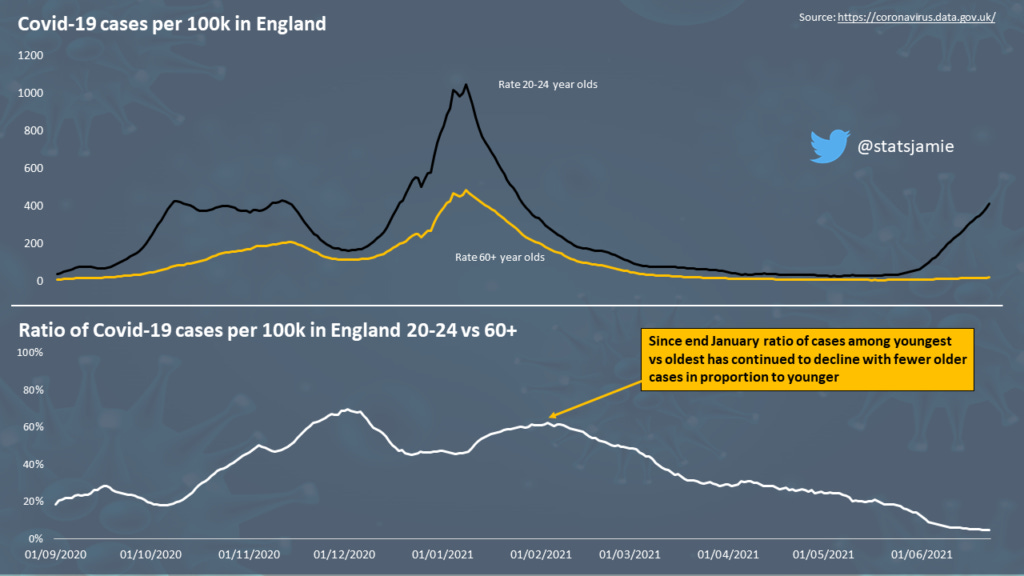 93% of the deaths where Covid-19 was mentioned on the death certificate are among people aged 60 and over. If we track the recent Covid-19 case rises the biggest driver is people aged 20 to 24. I have looked at the rate for this age group compared to people aged 60 and over and there has been little change in the rate for older people (shown by the yellow line on the graph below).