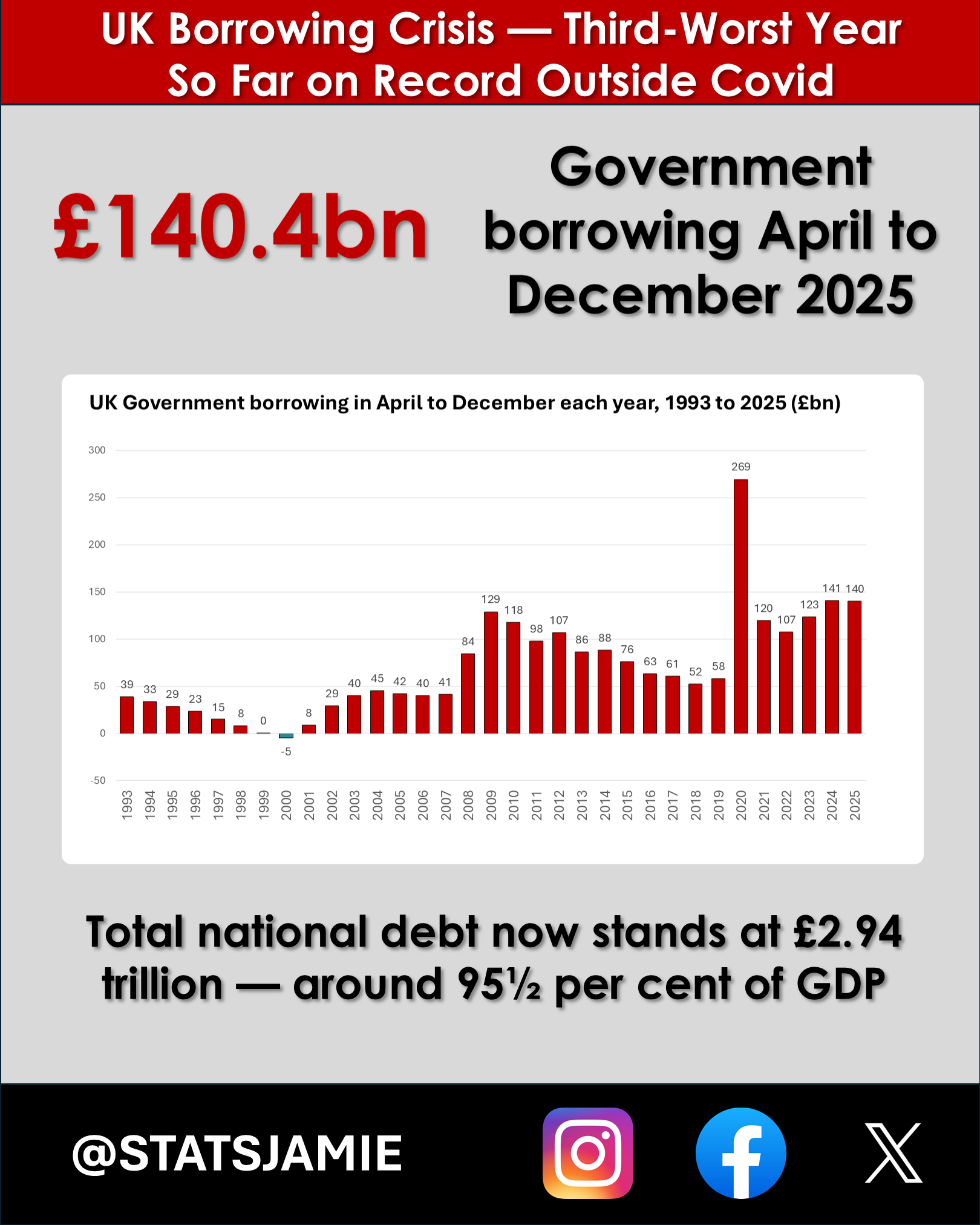 Government borrowing from April to December 2025 has now reached £140.4bn — the third-worst year on record outside Covid.