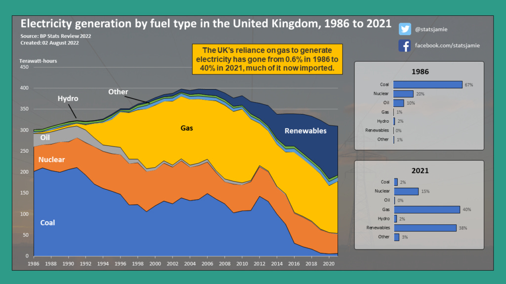 The UK’s reliance on gas to generate electricity has gone from 0.6% in 1986 to 40% in 2021