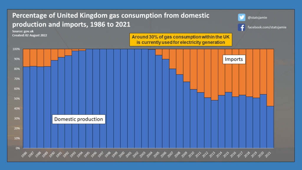 Around 30% of the total UK gas supply is used to generate electricity, with 37% used domestically to heat homes and the remaining 33% across industry and services. But what has changed over the past 20 years is the reliance on importing gas to meet demand. With the UK now importing more gas than what we produce domestically, this exposes us to world markets, with no opportunity for Government regulation, not only for domestic gas use but also for electricity.