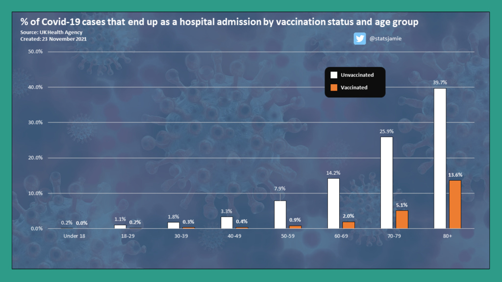 To overcome this, I have taken the number of cases among those vaccinated and unvaccinated in weeks 41 to 44 as published by the UKHA and taken the percentage admitted to hospital in weeks 42 to 45, assuming there is a lag for many between a positive test and an admission. In doing this, you can see the infection to hospitalisation rate is higher for unvaccinated vs vaccinated for each of the different age groups. Remember for some people there may be health reasons for not having a vaccine and these may be more vulnerable to admission to hospital.