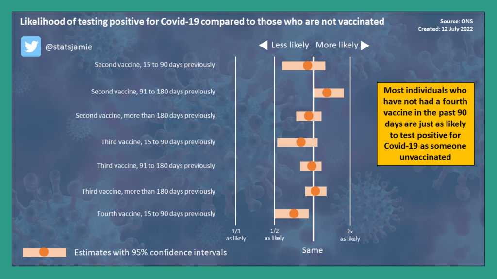 The latest data from the Office for National Statistics (ONS) shows us that individuals who have not had a fourth vaccine in the past 90 days are just as likely to test positive for Covid-19 as someone unvaccinated. Most people in the UK have not had a fourth vaccine, and this data covers the fortnight ending 07 May 2022. The data is consistent with reports over the winter that COVID-19 protection wanes 90 days after having had a dose of a vaccine.