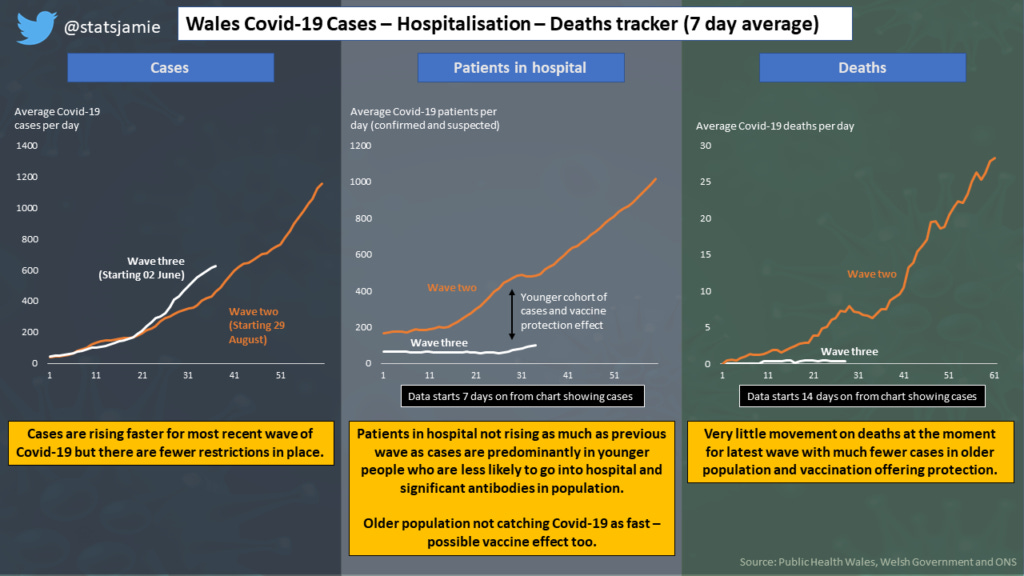 Comparing the data on cases, hospitalisations and deaths for the most recent wave that started early June and the second wave that started around the end of August we see fewer people in hospital with Covid-19 than previously in relation to the number of cases, and hardly any deaths. This is down to several factors, firstly most of the rise in cases are among younger people who are less likely to end up in hospital. Second, we are not seeing the link in a rise in cases in older people in relation to younger people, possibly because of the vaccine. Third, with significant antibodies in the population, those who succumb to the virus are less likely to fall seriously ill and die.
